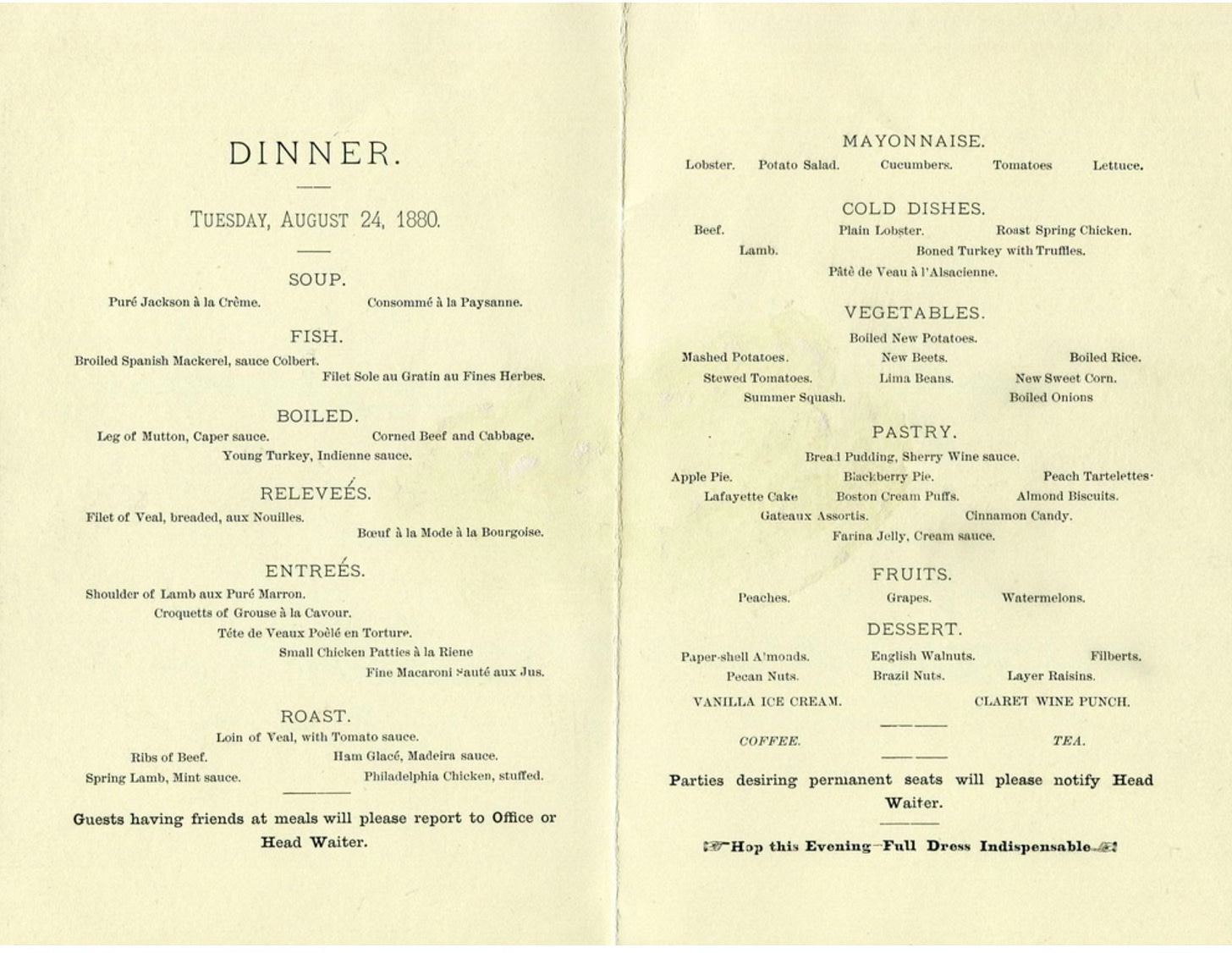 I’m just nerdy enough to enjoy reading historic restaurant menus as a primary source. Hotel restaurant menus of the times offer an overwhelming variety of choices by modern standards—it was the Gilded Age, after all. How would a woman raised on a subsistence farm react when presented with that?